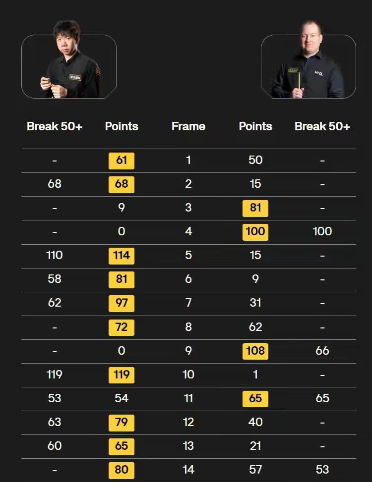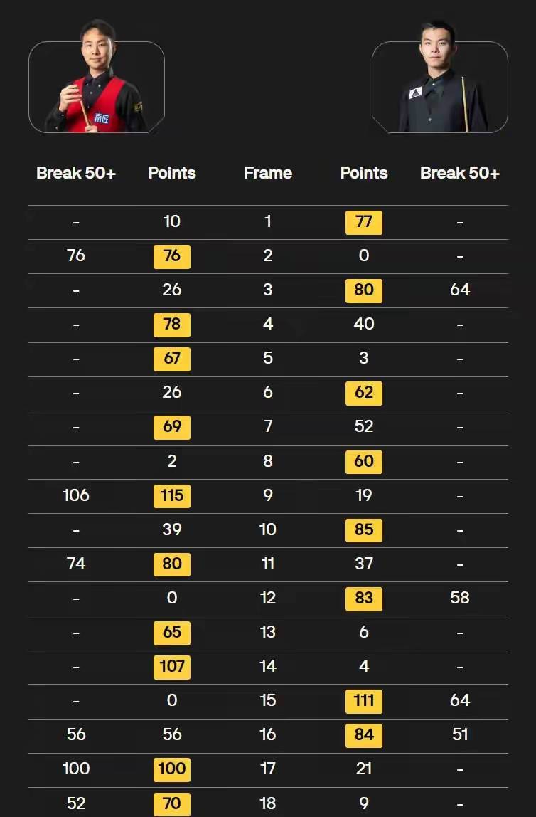 徐念念和刘宏宇那场是内战,手心手背齐是肉,但没主义,总得有东谈主走,徐念念10-8赢了,两杆破百四杆50+,数据上照实压了刘宏宇一头。