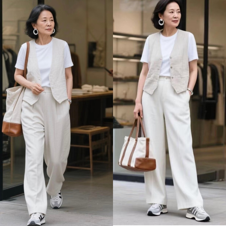 比如白色T恤,选择白色亚麻阔腿裤搭配,上衣叠穿白色马甲加多端倪感,同期擢升腰线。灰色指示鞋和棕色拼接包包呼应,50+女性也能穿出斯文年青又高等造型。