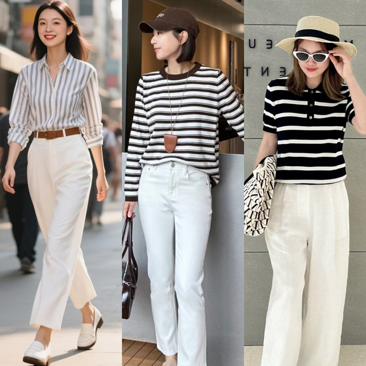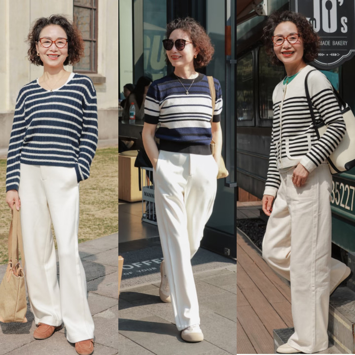 经典条纹元素,自带复旧气味。春夏日节,选择条纹上衣和白色裤子搭配,斯文又洋气。