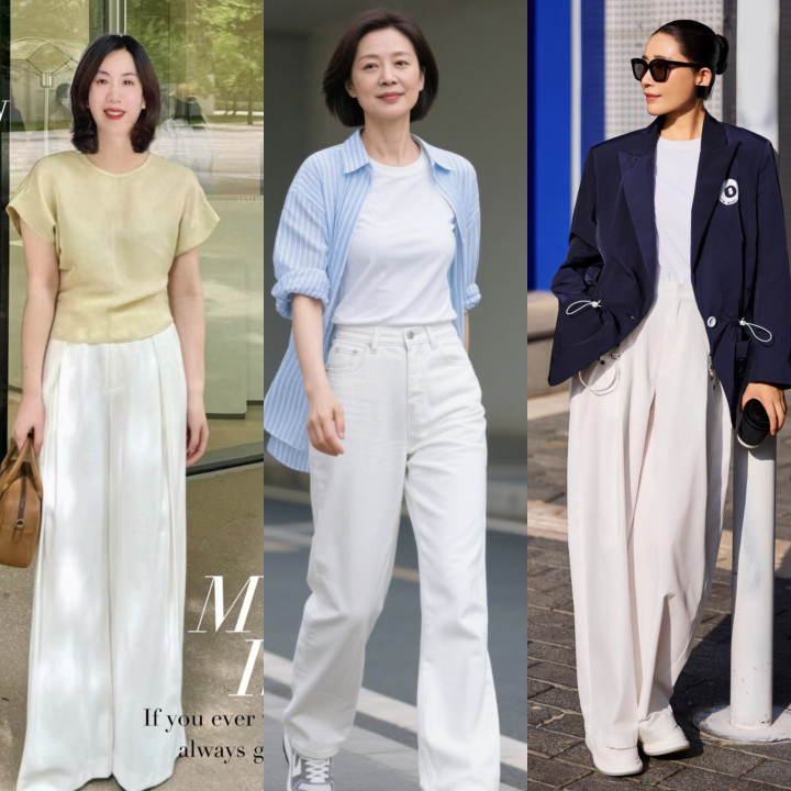 因为白裤子自带反光滤镜,有提亮肤色的视觉成果,穿上身利落显精神,几乎等于中年女性减龄神器。其次白裤子从简百搭,符合搭配不同豪情上衣,打造出不同气质。