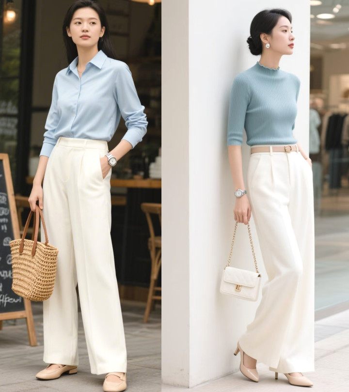 比如白色直筒裤+浅蓝色衬衫,职场这样穿,利落又露馅。淌若和一又友约会,上衣换成雾霾蓝真诚中袖,则显得气质优雅又高等。