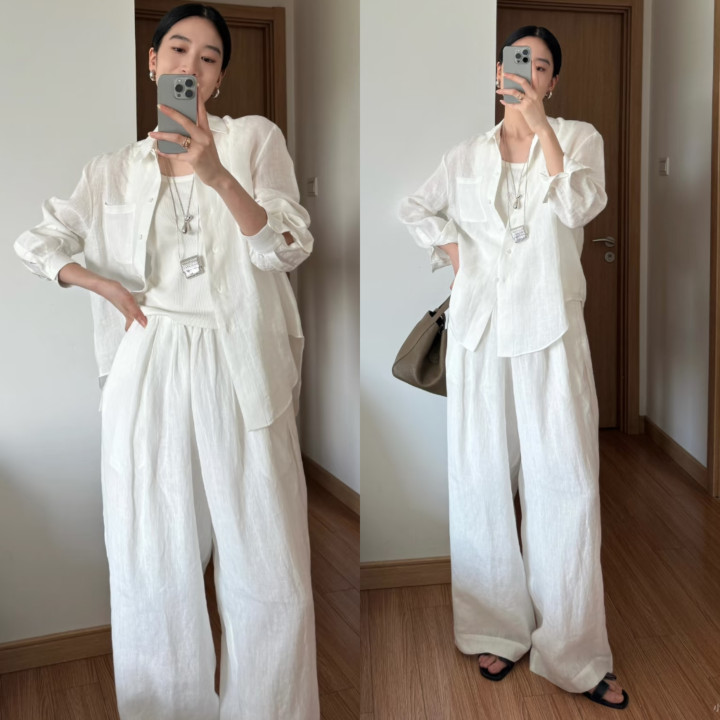 淌若穿上白色亚麻阔腿裤,上衣搭配同豪情同材质衬衫,白色背心打底叠穿,加多端倪感,造型慵懒随心又洋气。