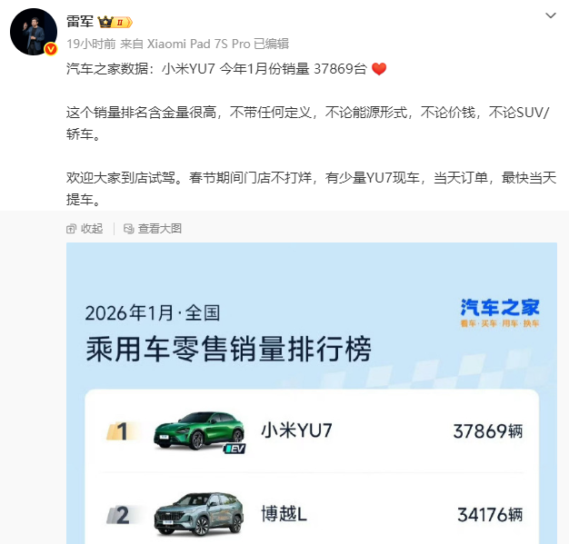 2月12日,雷军发文称,小米YU7本年1月的销量达37869台。按照第三方平台的名次榜,小米YU7为1月乘用车零卖销量冠军。他示意:“这个排名含金量很高,不带任何界说,岂论动力体式,不讲价格,岂论SUV/轿车。”