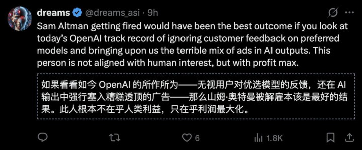 网友月旦了奥特曼「与东谈主类利益不一致,只追求利润最大化」,在AI输出中插入告白的作念法,甚而默示奥特曼在2023年被片霎革职本应该是「最好结局」。