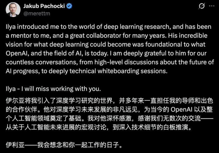 Jakub在Ilya的推文下留言,称其为我方的导师和出色的相助伙伴,并称会思念和Ilya沿路管事的日子。