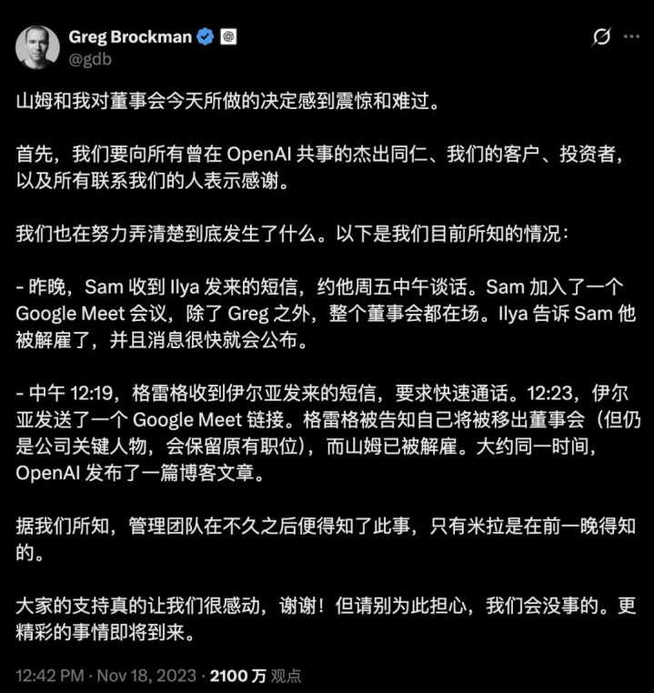 最终,这场「政变」并未持续太久,便以奥特曼官宣复职,重掌CEO权杖告终。