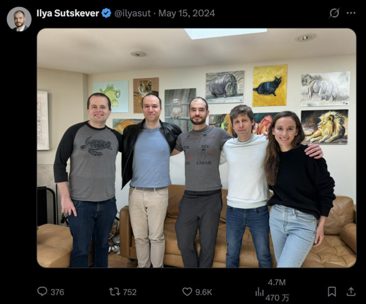 在2023年主导了那场免除奥特曼OpenAICEO职务的活动之后,2024年3月,Ilya秘书了离开OpenAI的音信,他还在X平台上晒出了与Jakub等东谈主的合照。