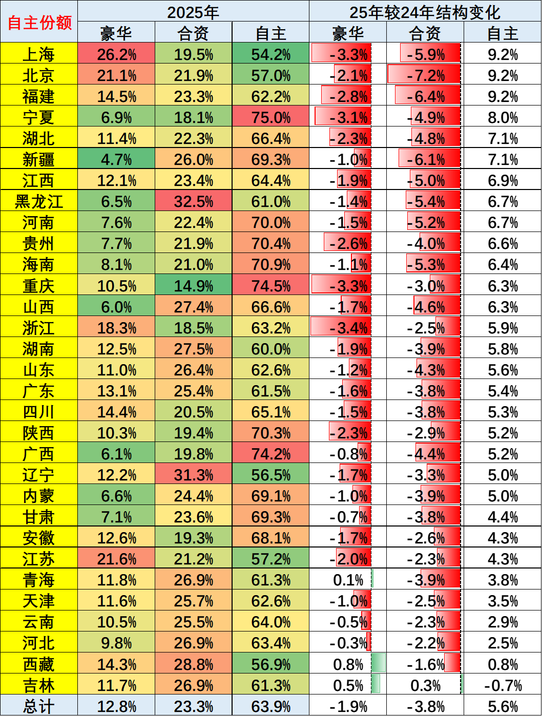 此外,2025年,吉林省豪华、合伙以及中国品牌的占比差别为11.7%、26.9%与61.3%,豪华、合伙差别结束了0.5%、0.3%的微增,自主品牌则出现了0.7%的同比下滑,亦然通盘地区中独一中国品牌同比下滑的地区。
