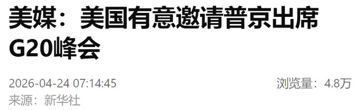 据好意思国媒体报说念,好意思国政府官员23日泄漏,好意思方特意邀请俄罗斯总统普京出席定于本年12月在好意思国迈阿密举行的二十国集团(G20)指引东说念主峰会。