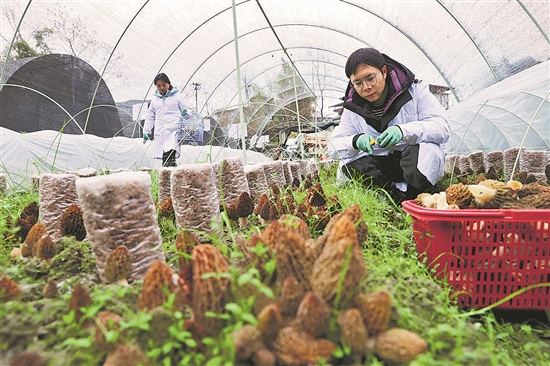 2月24日,在重庆市黔江区石会镇中元村羊肚菌品种圃考试基地,该区武陵山食用菌询查院的时期东谈主员在采摘筛选新品种羊肚菌。